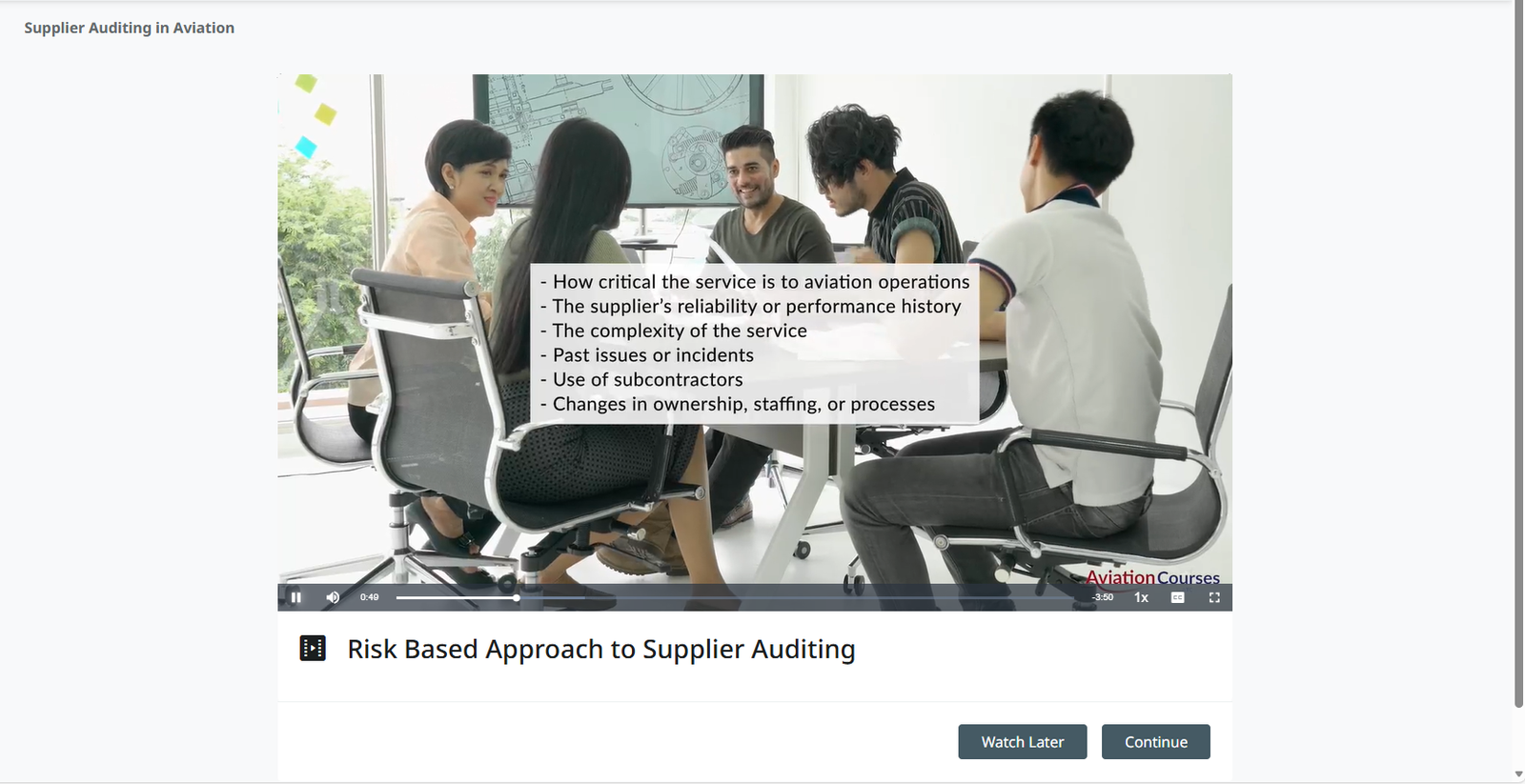 The Supplier Auditing in Aviation online course is designed to equip compliance, safety, quality, procurement, and operational personnel with the skills and knowledge required to effectively audit aviation service providers. The course covers the core principles of supplier oversight, including regulatory requirements, audit planning, risk assessment, evidence gathering, and structured reporting.